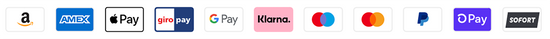 PayPal, Amazon Pay, Apple Pay, Klarna purchase on account, Klarna, Sofortüberweisung, Shopify Pay, Visa credit card, Mastercard credit card, AMEX American Express credit card